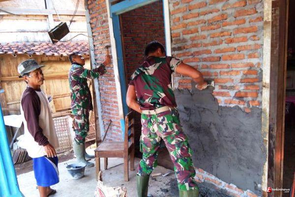 Anggota Satgas TMMD Reguler -109 Kodim 0715/Kendal,dengan cepat mengerjakan mlaster dinding tembok Rumah Tidak Layak Huni (RTLH) milik Saeri (53), warga desa Sendang Kulon,Kecamatan Kangkung,Kabupaten Kendal.