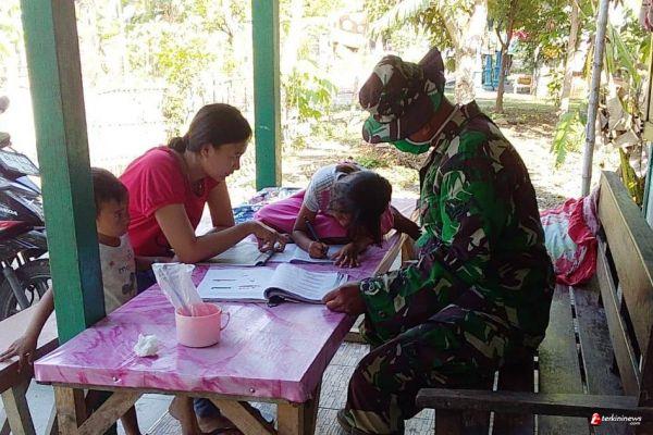 Sersan Satu Mukhamad Niti, disela waktu istirahatnya masih menyempatkan waktu untuk berbagi dan bertebar kebaikan di bidang pendidikan dengan mendatangi warga yang sedang belajar bersama putra putrinya, serta ikut membimbing mengarahkan untuk mengenal huruf dan merangkai huruf menjadi bacaan.