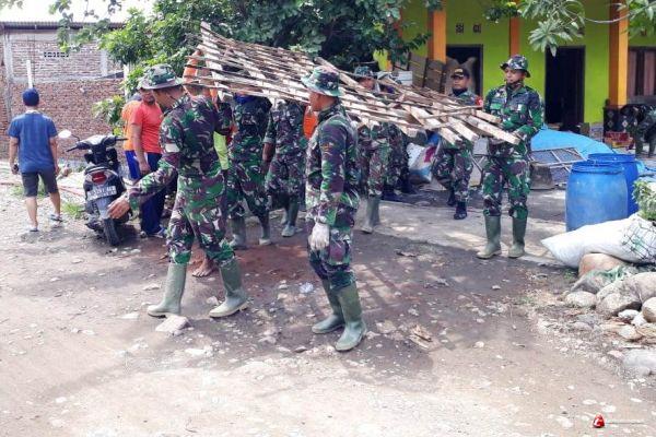 Satgas TMMD ke-109 Kodim 0715/Kendal bahu-membahu bersama membantu masyarakat Desa Ngerjo untuk membersihkan sisa-sisa reruntuhan rumah dan memperbaiki atau memasang genting rumah warga.