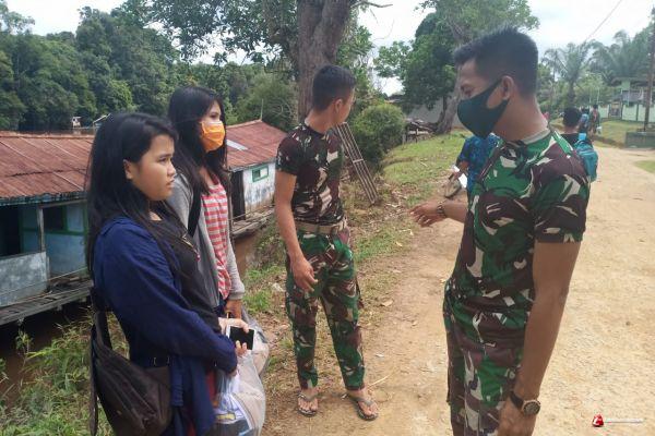 SINTANG - Ditengah Pandemi Corona Virus Disease (Covid 19) yang belum berakhir di Kabupaten Sintang dan sekitarnya sebab itu Anggota Satgas TMMD Reguler 109 Kodim 1205/Sintang selain menjalankan tugas pokok dan fungsinya (Tupoksinya) juga selalu menyapa dan mengingatkan masyarakat untuk selalu disiplin protap Covid 19.