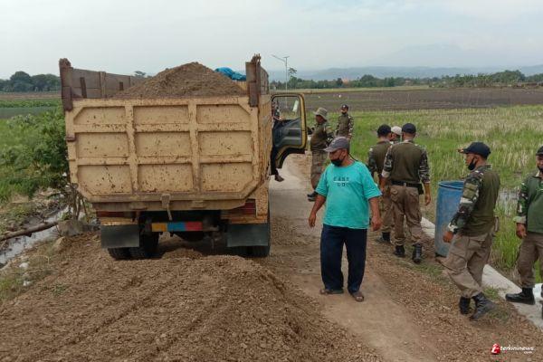 Di tahap itu, penyiapan material untuk pembereman jalan, sejumlah truk keluar masuk mengangkut material sirtu untuk urugan berm memperkuat jalan beton.