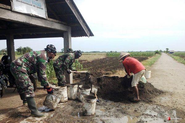 KENDAL- terkininews.com Sejumlah TNI anggota Satgas TMMD Reguler ke-109 Kodim 0715/Kendal di Desa Sendang Kulon, Kecamatan Kangkung, Kabupaten Kendal, Jawa Tengah, disisa waktu purna tugas, bersama kelompok tani Desa Sendangkulon, bergotong royong memperbaiki Balai Tani yang ada di pinggiran sawah. Kebetulan lokasinya berdekatan dengan sasaran fisik utama TMMD, pengecoran jalan tersebut.