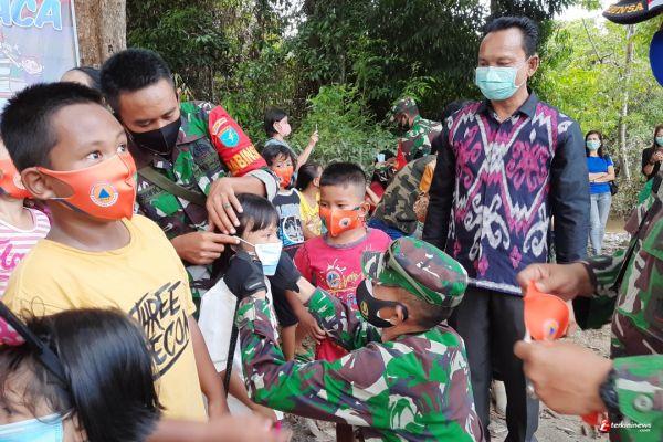 SINTANG - Komandan Satuan Tugas (Satgas) TNI Manunggal Membangun Desa (TMMD) Reguler 109 Kodim 1205 Sintang , Letkol Inf Eko Bintara Saktiawan memasangkan masker pada anak-anak di Desa Sasaran TMMD. Hal tersebut dilakukannya supaya anak-anak selalu mematuhi protokol kesehatan diantaranya mengenakan masker saat beraktifitas diluar rumah.