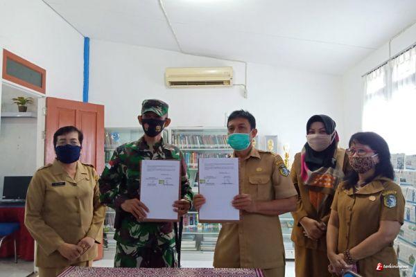 SINTANG - Komandan Satuan Tugas (Satgas) TNI Manunggal Membangun Desa (TMMD) Reguler 109 Kodim 1205 Sintang, Letkol Inf Eko Bintara Saktiawan bersama kepala Dinas Perpustakaan dan Kearsipan (DPK) kabupaten Sintang, Iwan Setiadi menandatangi Nota Kesepahaman terkait kerjasama dalam rangka pelaksanaan gerakan literasi nasional di Kabupaten Sintang, Selasa (20/10/2020).