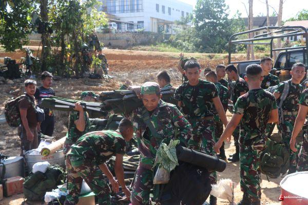 Sejumlah personel Satgas TMMD terlihat sudah mulai mempersiapkan sejumlah peralatan sebelum pergeseran pasukan (serpas) kembali menuju tempat tugas sebelumnya.