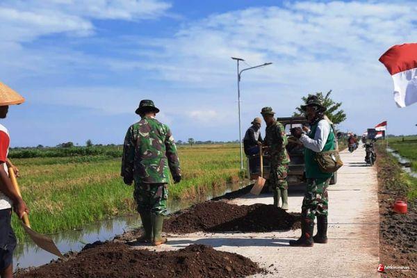 Tampak Satgas TNI dan warga masih semangat melakukan finishing pengurugan tanah di kanan kiri jalan, yang dihiasi sang saka merah putih yang memberikan motivasi kepada warga dan khususnya kepada Satgas yang mengemban tugas di lokasi TMMD.