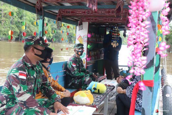 SINTANG - Usai meresmikan Perpustakaan Apung di Batas Negeri Kodim 1205/ Sintang, Dansatgas TMMD 109/Sintang Letkol Inf Eko Bintara Saktiawan, didampingi Danramil Merakai, Ketungau Tengah, Serma Bambang menaiki Perpustakaan Apung untuk menuju ke lokasi Dermaga Gemar Membaca di Desa Wira Yuda, Minggu (18/10).