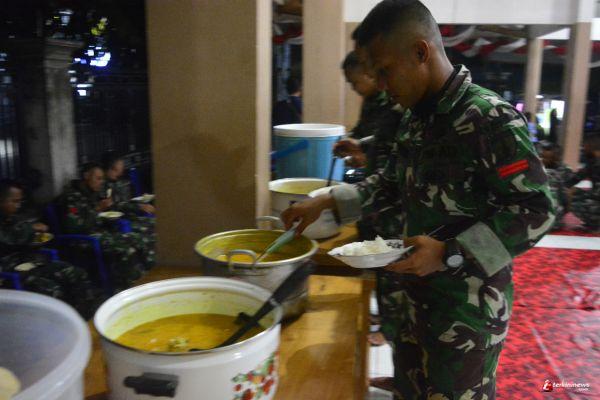 Lamongan,- Pratu Rahmat, anggota satgas TMMD 109 Kodim 0812/Lamongan sedang mengambil makanan setelah acara syukuran selesai karena setelah mendengarkan ceramah serta doa, mereka baik anggota satgas TMMD dan warga Desa Tebluru melaksanakan ramah tamah.