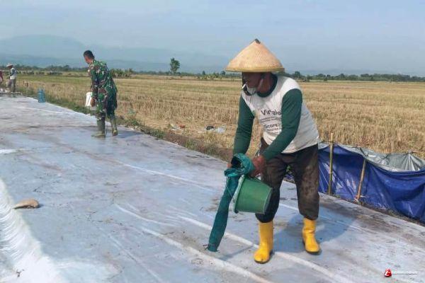 Sejumlah personil TMMD Reguler ke-109 Kodim 0715/Kendal yang tengah tuga di Desa Sendang Kulon, Kecamatan Kangkung, Kabupaten Kendal, Jawa Tengah, dengan dibantu warga, diplot untuk melakukan perawatan hasil pengecoran jalan yang sudah selesai. Hal itu dimaksudkan agar hasil akhir nanti bagus dan tidak mudah pecah.