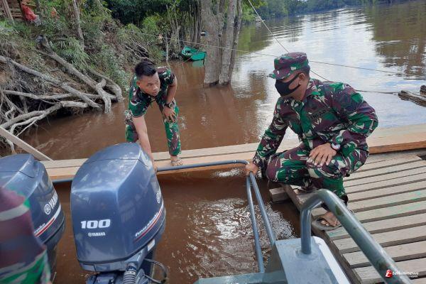 SINTANG- Plh Koramil 1205-09/ Merakai, Serka Bambang membantu Personel Satuan Tugas (satgas) TNI Manunggal Membangun Desa (TMMD) Reguler 109 Kodim 1205/Sintang menahan Kapal Motor Cepat (KMC) supaya dapat bersandar dengan baik di dermaga Desa Wirayuda Kecamatan Ketungau Tengah.