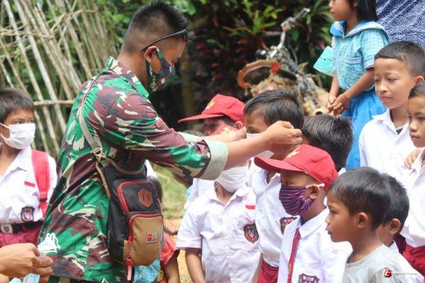 SINTANG - Disela Kegiatan memperkenalkan Perpustakaan Apung di Batas Negeri, Prada Yugo membagikan masker kepada murid-murid SDN 41 Kebangak, Minggu (25/10/2020).