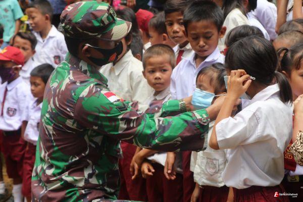 Sebelum memasuki Perpustakaan Apung Batas Negeri Kodim 1205/Sintang, Prada Yugo, salah satu anggota Satgas TMMD 109/Sintang membagikan masker kepada Murid SDN Kebangak Desa Kebangak Kecamatan Ketungau Tengah. Sudah menjadi kebiasaan, para siswa yang sedari pagi datang, mengantri untuk mendapatkan dan memakai masker secara gratis.