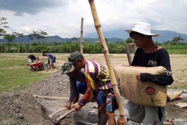 Terlihat saat ini masyarakat melaksanakan pembuatan lapangan bola voli melanjutkan apa yang sudah dikerjakan anggota satgas bersama warga sebelumnya dengan gotong-royong.