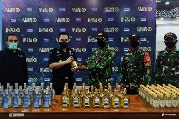 Dansatgas Pamtas Yonif 407/PK, Letkol Inf Catur Irawan, S.I.P., M.I.P mengatakan, ratusan minuman keras berbagai merek seperti Elenford Vodka Flavour, Tequila, Lemon Gin merupakan hasil tangkapan oleh anggota Pos Sei Tekam Satgas Pamtas Yonif 407/PK yang melakukan patroli wilayah pada malam hari.