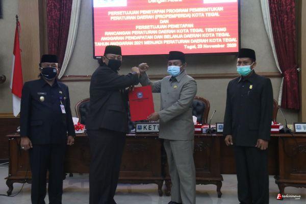 TEGAL - DPRD Kota Tegal menyetujui Program Pembentukan Peraturan Daerah (Propemperda) Kota Tegal Tahun 2021 dan Rancangan Peraturan Daerah (Raperda) Kota Tegal tentang Anggaran Pendapatan dan Belanja Daerah (APBD) Kota Tegal Tahun Anggaran 2021 untuk menjadi Perda Kota Tegal.