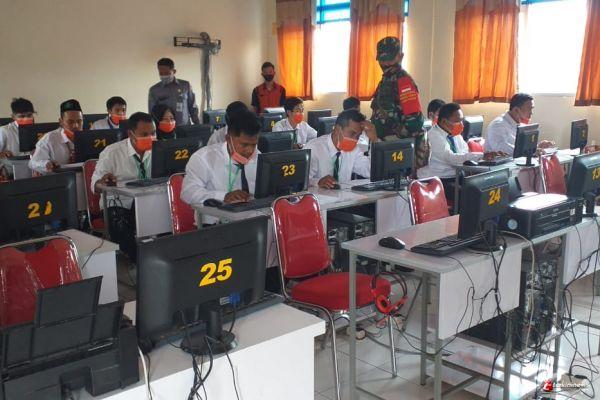 Cilacap - Bati Tuud Koramil 09/Kawunganten Serma Mustadi turut serta mengawasi jalannya Ujian Praktek dan Ujian tertulis calon perangkat Desa Bojong formasi Kepala Dusun Jayagiri bertempat di Gedung Berlian dan SMK Negeri Kawunganten yang berlokasi di Desa Bojong Kecamatan Kawunganten, Rabu (25/11/20).