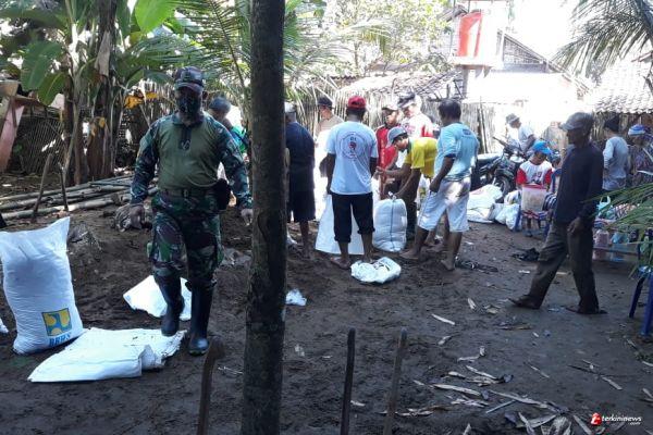 Cilacap- Babinsa Cilopadang, Koramil 13 Majenang Sertu Darsono bersama masyarakat Dusun Benda, Desa Cilopadang dan sekitarnya yang berjumlah 65 orang melaksanakan Karya Bhakti pembendungan tanggul Sungai Cileumeuh yang berlokasi di Dusun Benda tepatnya di belakang rumah Ketua RT. 03/RW. 11 Supriyanto yang jebol akibat tidak mampu menampung debit air yang sangat besar, Minggu(20/12).