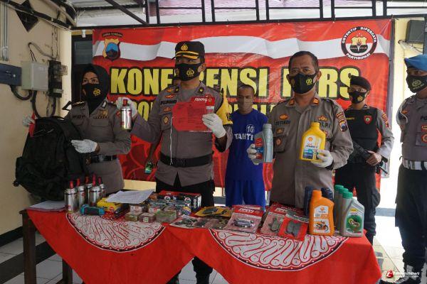 Dari tangan tersangka diamankan sejumlah barang bukti hasil pencurian yang dilakukannya. Barang bukti tersebut diantaranya berbagai jenis sparepart kendaraan, berbagai jenis dan merk oli kendaraan botolan, bor dan mata bor, aki serta tas gendong motif doreng.