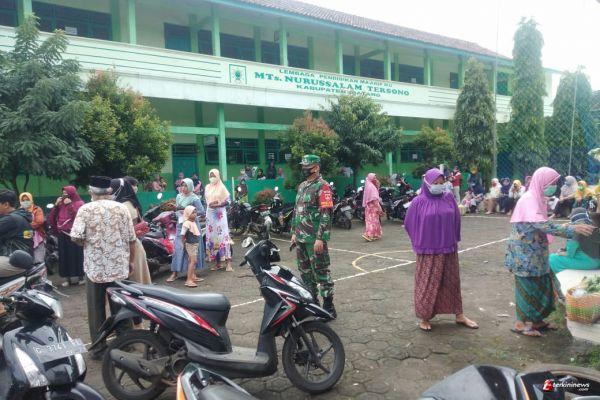 Personel Bintara Pembina Desa (Babinsa) Koramil 06/Tersono Pelda Zaenal Arifin mengawal pembagian Bantuan Langsung Tunai (BLT) APBD di balai Desa Satriyan, Kecamatan Tersono, Kabupaten Batang, Kamis (14/1/21).