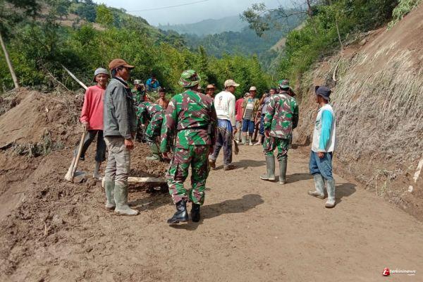 Sinergitas TNI-Polri Bantu Warga Bersihkan Material Longsor
