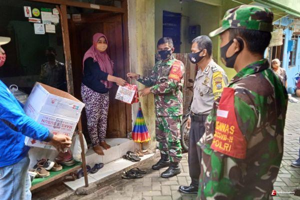 SURAKARTA- Babinsa Kelurahan Sewu Koramil 04/Jebres Kodim 0735/Surakarta Serka Suryanto dan Sertu Suparno bersinergi dengan Bhabinkamtibmas Aiptu Suwardi bersama Relawan Sibat melakukan langkah pencegahan penularan dan pemutusan mata rantai penyebaran virus corona (Covid-19) dengan membagi-bagikan masker dan sabun kepada warga di RW 8 wilayah Kelurahan Sewu, Sabtu, (23/1/2021).