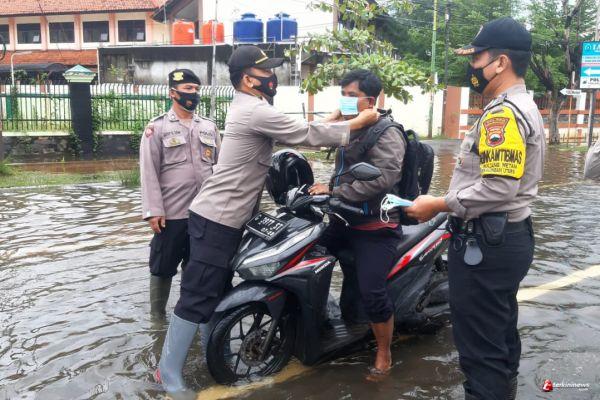 Sembari cek lokasi perkampungan warga yang tergenang air hujan menyerukan imbauan protokol kesehatan, petugas juga memberikan masker gratis sebanyak 150 biji kepada warga yang belum memakai masker.