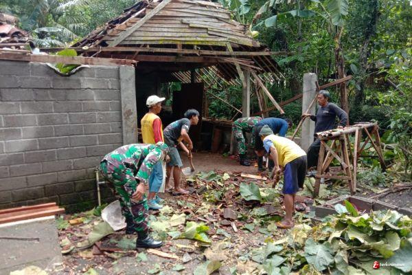 WONOGIRI – Anggota Koramil 17/Sidoharjo yang dipimpin Serma Anjar, bersama warga, bekerja bakti membersihkan puing puing pohon tumbang dan reruntuhan rumah milik beberapa warga di enam desa di Kecamatan Sidoharjo, Jumat (5/2).
