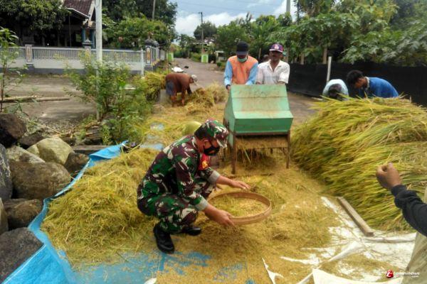 Babinsa Bantu Panen Sekaligus Sosialisasikan Pencegahan Covid 19