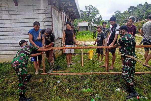 KALIMANTAN- Satgas Pamtas RI-Malaysia Yonif 407/PK bersama masyarakat melaksanakan karya bakti Pembuatan pagar di Balai Desa Jasa, Dusun Wakampuh, Desa Jasa, Kecamatan Ketungau Hulu, Kabupaten Sintang, Kalbar.