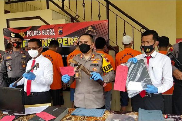 Kapolres Blora AKBP Wiraga Dimas Tama,SIK didampingi Kasat Reskrim AKP Setiyanto,SH,MH, Kasat Sabhara Iptu Isnaeni, SH,MH serta Kasubbag Humas AKP H. Soeparlan,SH dan Kaur Bin Ops Satreksrim Iptu Edi Santosa,SH serta Kasi Propam Ipda Hadi, saat konferensi pers mengungkapkan bahwa