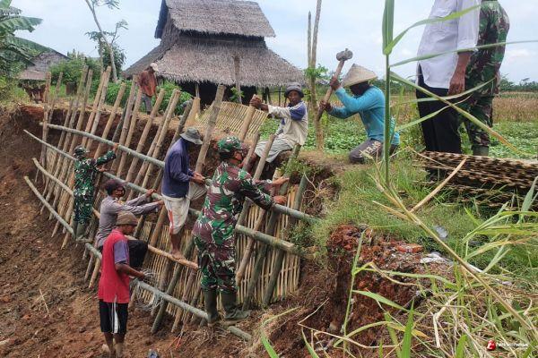 KENDAL- Koramil 05/Cepiring Kodim 0715/Kendal melaksanakan kerja bhakti penambalan tanggul Kali Blukar di Ds. Pandes Kec. Cepiring, Rabu (17/02/2021).