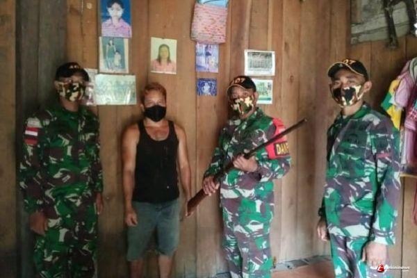 KALIMANTAN- Seorang warga Dusun Wakampuh, Desa Jasa, Kecamatan Ketungau Hulu, Kabupaten Sintang menyerahkan satu pucuk senjata laras panjang jenis Bowman kepada anggota Pos Kampung Jasa Satgas Pamtas RI-Malaysia Yonif 407/PK. Kamis, (18/02/2021)