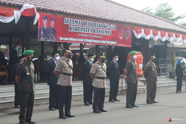 Bupati Banyumas, Ir. Achmad Husein dalam sambutannya menyampaikan peringatan hari jadi ini berbeda dengan sebelumnya karena adanya pandemi Covid-19 yang melanda hampir seluruh dunia yang telah mengubah berbagai tatanan kehidupan. "Dengan adanya pandemi Covid-19, peringatan Hari Jadi Ke-450 Kabupaten Banyumas diselenggarakan sederhana, minimalis, serta dengan menerapkan protokol kesehatan pencegahan Covid-19. Begitupun dengan kegiatan yang biasa diselenggarakan untuk memeriahkan peringatan hari jadi ini ditiadakan", papar Bupati.