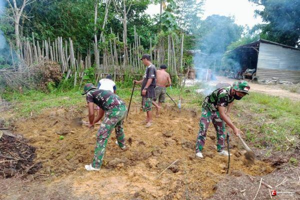 Satgas Pamtas Yonif 407/PK Karya Bhakti Bersama Warga Bangun Sarana Olahraga