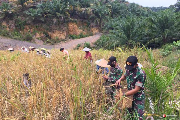 Satgas Pamtas Yonif 407/PK Bantu Warga Perbatasan Panen Padi