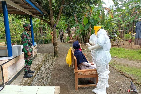 Cilacap - Babinsa Koramil 06 Kesugihan Serka Sartimin melaksanakan pendampingan tracing pemeriksaan kesehatan (Swab) oleh Tim Satgas Covid Kecamatan Kesugihan terhadap warga berstatus PDP (Pasien Dalam Pengawasan) Covid-19 asal Desa Bulupayung, Kecamatan Kesugihan, Kabupaten Cilacap, Senin (8/3).