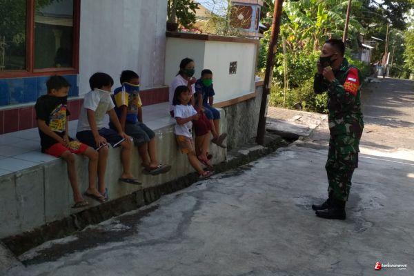 "Anak-anak ayo jangan lupa untuk memakai masker karena ini masih dalam masa pandemiCovid-19", begitu ucap Serda Purwoko kepada anak-anak yang tengah asik bermain tanpa mengenakan masker.