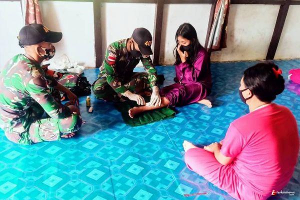 ​​​​​​KALIMANTAN- Tim Kesehatan Pos Sei Kelik Satgas Yonif 407/PK memberikan pertolongan pertama kepada Jelli Ridwan (16) warga Ds. Sungai Kelik, Kec. Ketungau Hulu, Kab. Sintang, yang mengalami luka terkena pecahan kaca Lemari saat membersihkan rumah. Senin (08/03/2021).