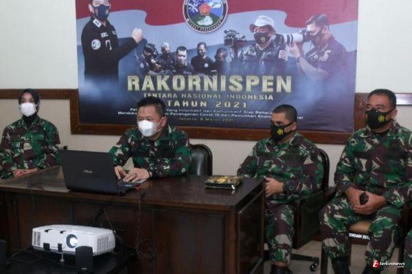 SEMARANG- Pusat Penerangan TNI menggelar Rakornis Penerangan TNI di Aula Balai Wartawan Puspen TNI dibuka oleh Kepala Staf Umum (Kasum) TNI Letjen TNI Ganip Warsito, S.E., M.M. Kegiatan yang juga digelar secara virtual ini diikuti seluruh Pejabat Penerangan jajaran TNI di tempat kerja masing-masing termasuk Kapendam IV/Diponegoro Kolonel Kav Susanto, S.I.P., M.A.P. yang mengikuti kegiatan secara virtual di Mako Pendam IV/Diponegoro, Jl. Perintis Kemerdekaan, Watugong, Semarang. Selasa (9/3/2021).