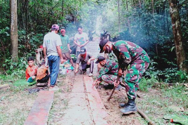KALIMANTAN- Personel Pos Kampung Jasa Satgas Pamtas RI-MLY Yonif 407/PK yang dipimpin oleh Kopda Eko bersama masyarakat bergotong-royong melaksanakan perbaikan jalan akses warga Dsn. Wakampuh, Ds. Jasa, Kec. Ketunggau Hulu, Kab. Sintang, Kalimantan Barat. Selasa (09/03/21).