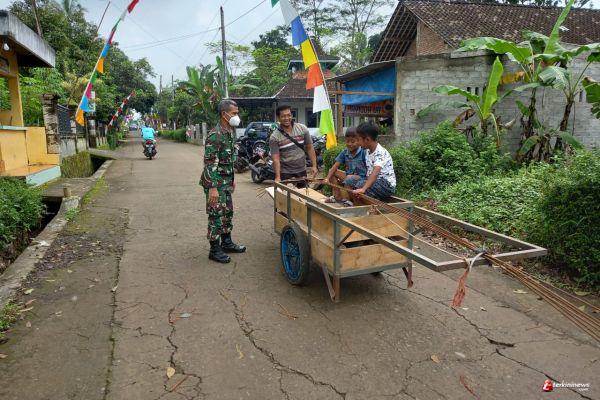 " Mau kemana ini, kok tidak pakai masker. Hati hati lho Covid masih ada, lindungi kalian dari virus Corona nak," tegur Sertu Sukamto kepada anak anak yang bermain di atas gerobak.