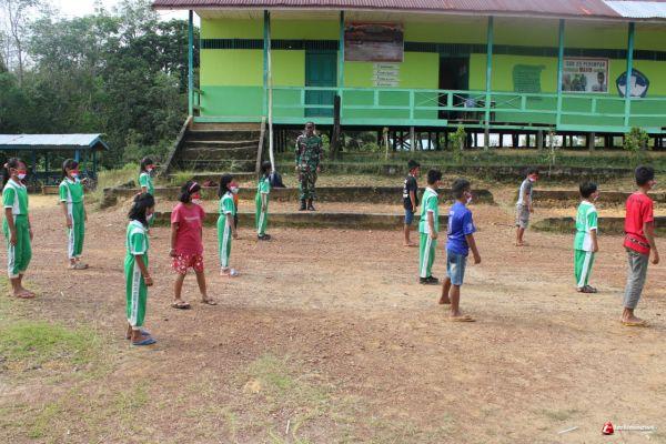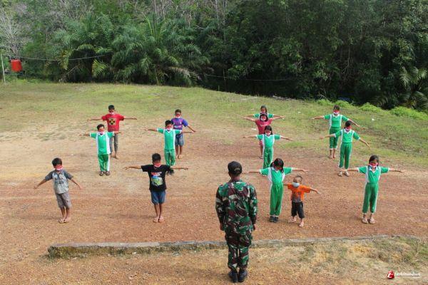Satgas Pamtas RI-MLY Yonif 407/PK Pos Sei Tekam memberikan bantuan tenaga pendidik dengan mengajarkan tata cara Peraturan Baris Berbaris (PBB) yang baik dan benar kepada siswa SDN 25 Perimpah yang berada di Dusun Sei Amplas, Desa Sei Tekam, Kecamatam Sekayam, Kabupaten Sanggau, Kalimantan Barat. Rabu (10/03/2021).