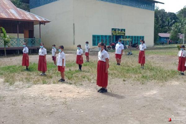 Pengkadan -Satgas Tmmd ke 110 Kodim 1206/Putussibau ajarkan Peraturan baris berbaris SD 05 Tintin Kemantan,10 Maret 2021