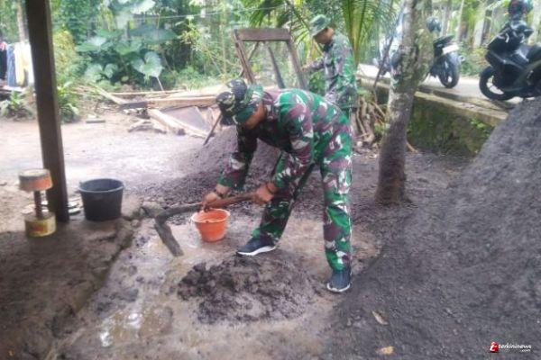 Kab. Semarang-Anggota Satgas TMMD Reg-110 Kodim 0714/Salatiga Serda Triyono aduk pasir dan semen memakai cangkul di tempat renovasi RTLH Sumarna Rt 05 Rw 03 Dusun. Sarimulyo Desa. Ketapang Kec. Susukan Kab. Semarang, Rabu (10/03/2021)