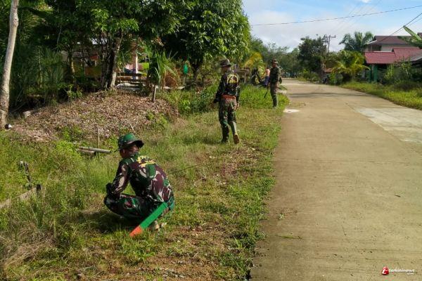 Beberapa anggota Satgas TMMD mengajak serta masyarakat yang berada Dusun Tintin Kemantan, Desa hulu Pengkadan, kecamatan Pengkadan, membersihkan jalan sepanjang perkampungan mereka.