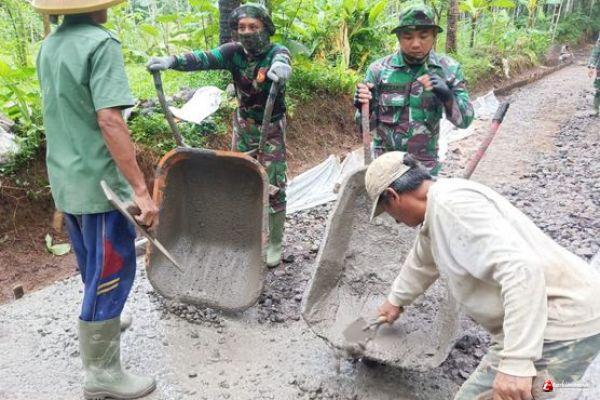 Kabupaten Semarang-Kopda Santo bersama warga membantu pelaksanaan pengecoran jalan di Desa Ketapang.