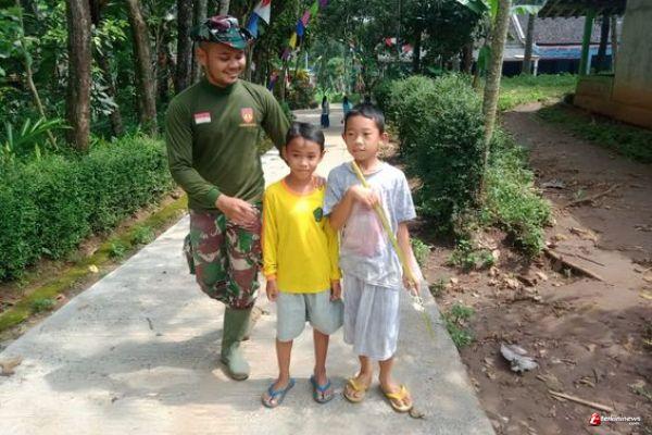 Salah Satu Anggota Satgas Bersama Dua Orang Anak dari Desa Ketapang Di Sela Istirahat Bekerja
