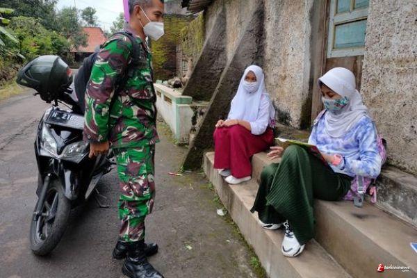 Kabupaten Semarang - Disela - sela waktu luang satgas TMMD Desa Ketapang Kecamatan Susukan Sertu Sukamto memberikan motivasi kepada siswi SD kelas 6 Desa Ketapang,anak- anak mengeluhkan,kapan pademi covid-19 ini berakhir.(10/03/2021)