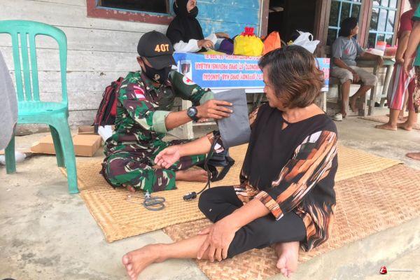 Prajurit Satgas Pamtas RI-MLY Yonif 407/PK anggota Pos Sei Tekam melakukan kegiatan bakti sosial pelayanan kesehatan dan pengobatan gratis kepada warga di Desa Sei Tekam, Kec. Sekayam, Kab. Sanggau, Kalimantan Barat. Sabtu (13/03/21).