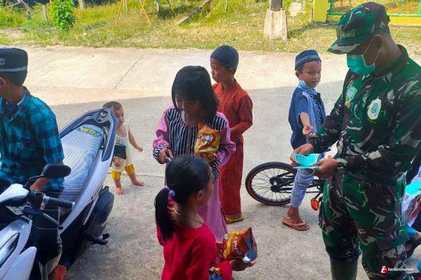 Peduli Kesehatan Anak-Anak Desa Hulu Pengkadan, Personil Satgas TMMD Ke 110 Kodim 1206/PSB Bagikan Masker